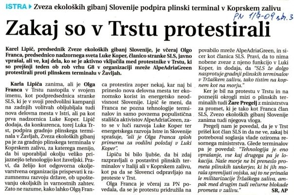 V tem članku je bil poleg drugih omenjena tudi mednarodna ekološka organizacija Alpe Adiria Green, ki je organizirala mirni protestni shod ob srečanju zunanjih ministrov G8 v Trstu proti izgradnji plinskih terminalov v Tržaškem zalivu in njegovi okolici.