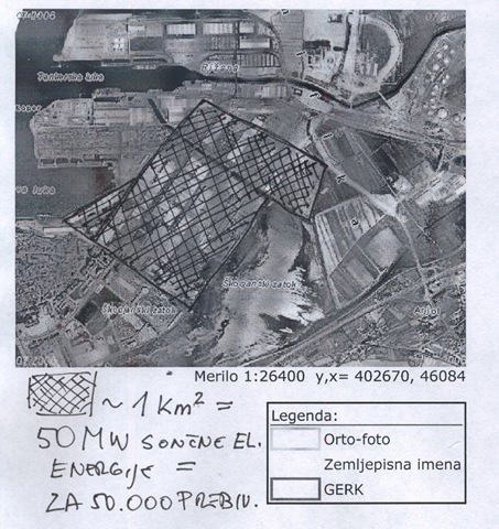 besede nobelovca Carla Rubbie iz oddaje Reporter, kjer je predstavljena soncna elektrarna v Spaniji, tj. en kvadratni kilometer proizvede 50 MW električne z izkoristkom sončne energije, kar je dovolj za 50.000 ljudi, smo navidezno umestili na prostor luke Koper, tj. na Gerku semo izločil okoli 100 ha površine v koprskem pristanišču…torej zakaj ta terminal in plinovod?