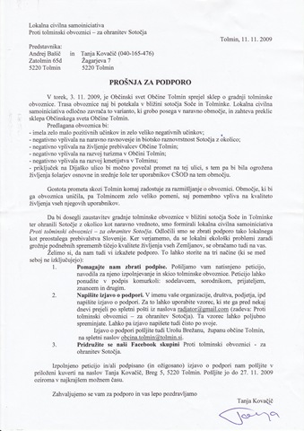 Prošnjo za pomoč poslano od civilne iniciative " PROTI tolminski obvoznici za ohranitev Sotočja" – W