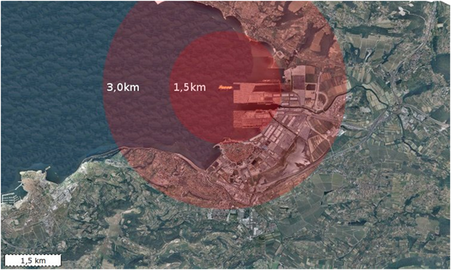 Območje, ki se nahaja v 3,0 km razdalji od predvidene lokacije terminala.