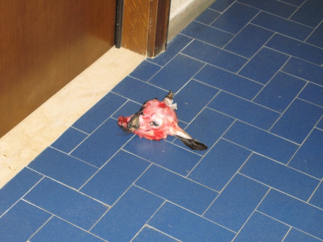 Giurastante je našel to krvavečo zadevo pod preprogo, ker je opazil nabreklino pod njim, ko se je popoldne vrnil iz urada Greenaction. Zdi se, da kozja glava (gl. sliko) pripada majhni rasi teh živali ali pa gre za mlad primerek, glava je pred kratkim odsekana, koža ni povsem olupljena in, kot že rečeno, so rogovi odsekani in usta na pol zlomljena.