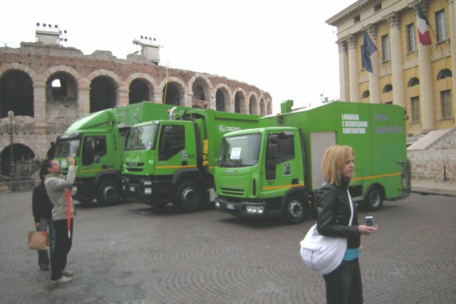Na trgu ispred arene izložena su vozila i mašinerija koju koristi preduzeće Amia Verona S.p.A. u čišćenju i sređivanju grada Verone.