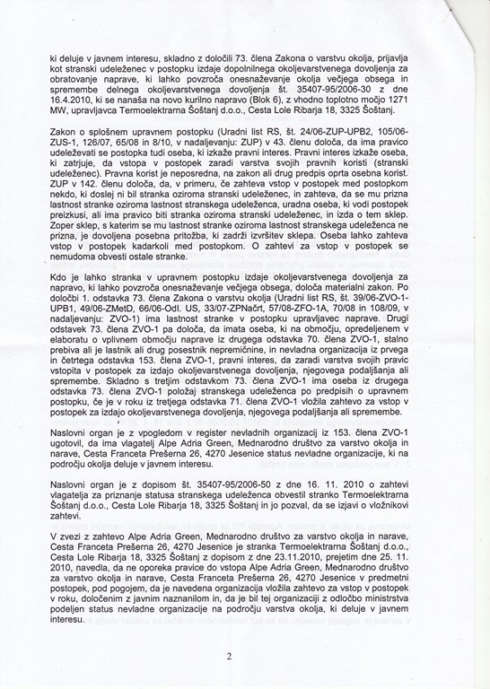 V obrazložitvi sklepa so v Agenciji za okolje zapisali, da ima Alpe Adria Green status nevladne organizacije, ki na področju okolja deluje v javnem interesu. O zahtevi AAG za priznanje statusa stranskega udeleženca so obvestili Termoelektrarno Šoštanj ter jo pozvali, da se izjasni o zahtevi. Iz Teša so jim odgovorili, da zahtevi ne oporekajo, a pod pogojem, da je ta organizacija vložila zahtevo za vstop v postopek v roku, določenim z javnim naznanilom, in da je bil organizaciji z odločbo ministrstva podeljen status nevladne organizacije na področju varstva okolja, ki deluje v javnem interesu. Ker so bili ti pogoji izpolnjeni, je Agencija društvu Alpe Adria Green lastnost stranskega udeleženca v postopku izdaje dopolnilnega okoljevarstvenega dovoljenja za blok 6 priznala.
