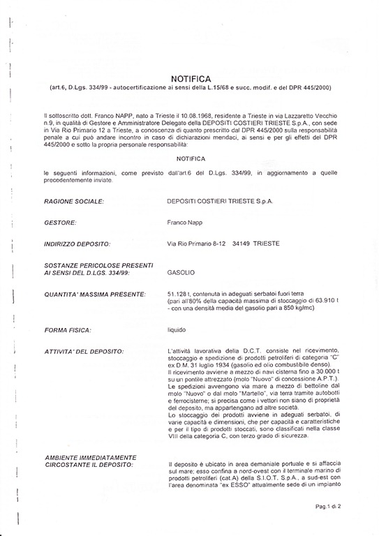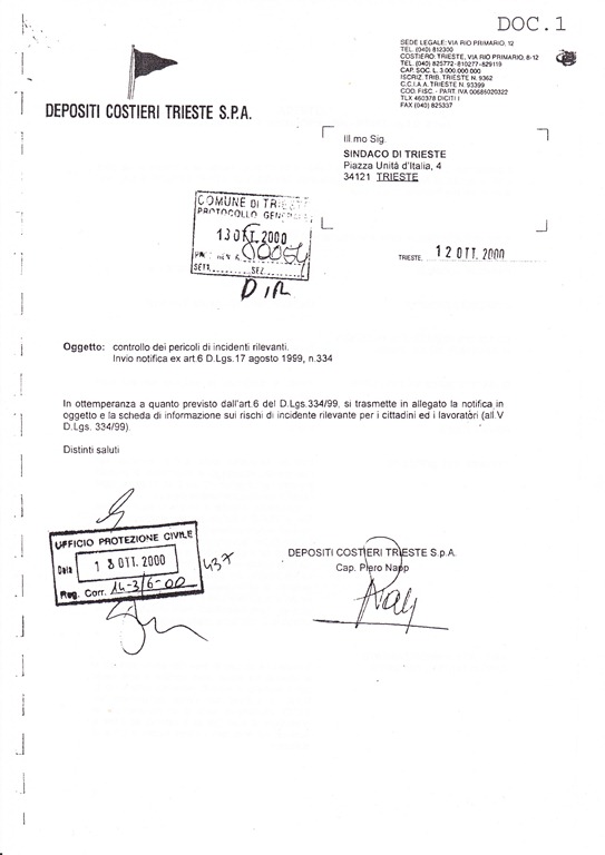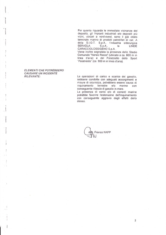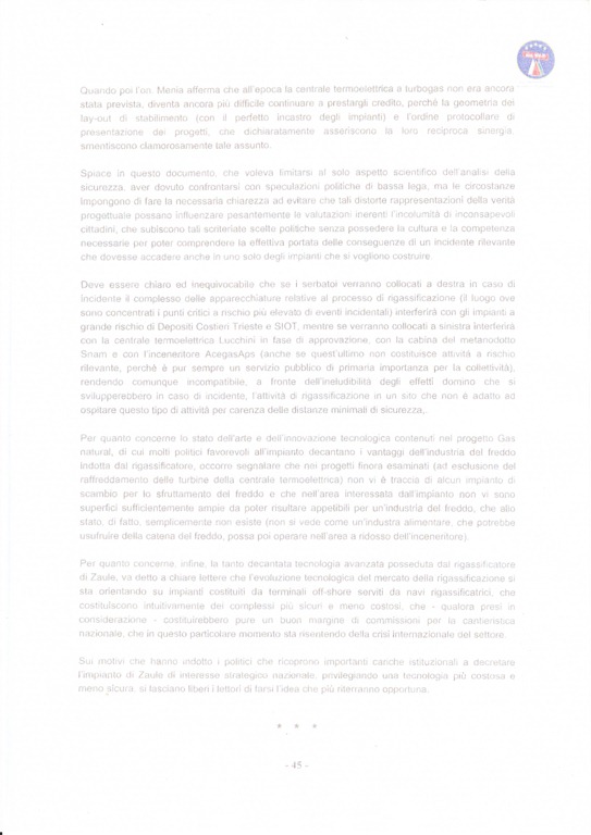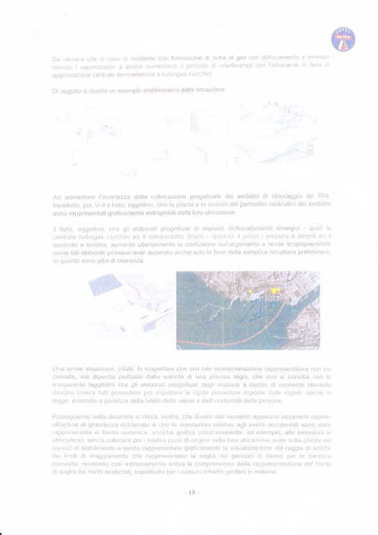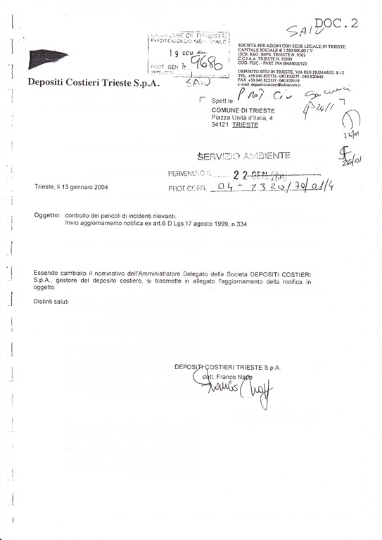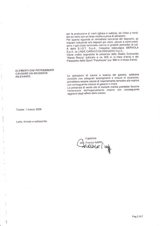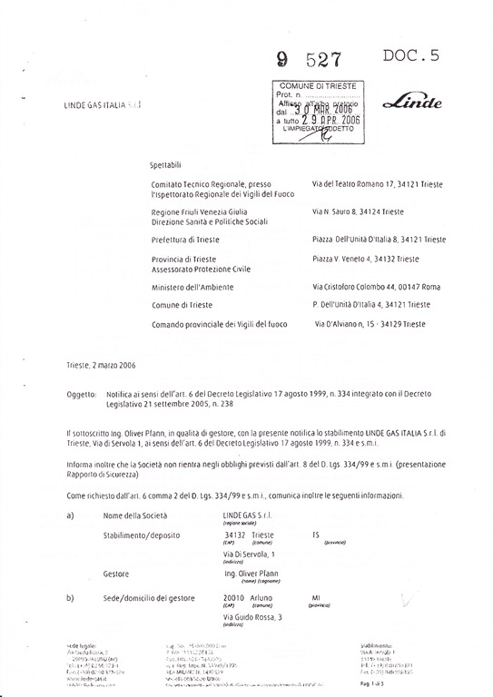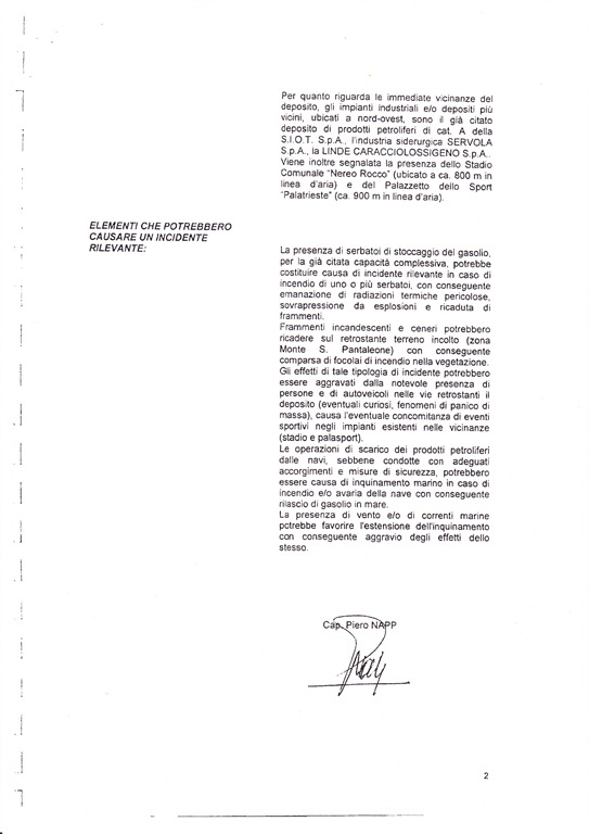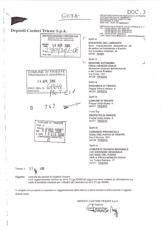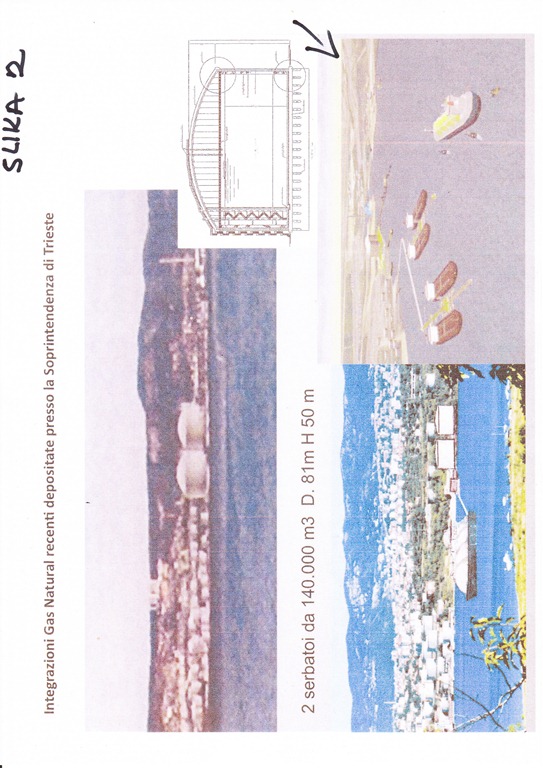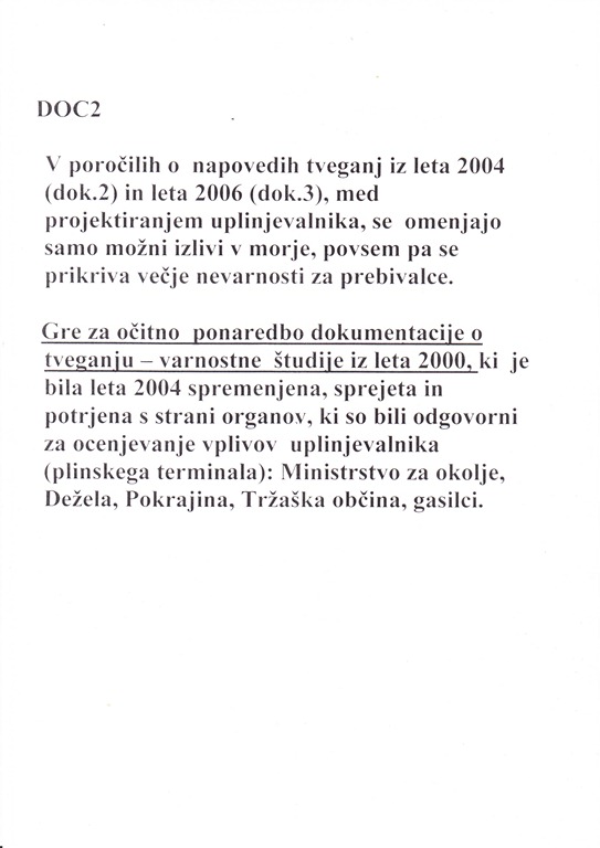 DOC2 – V poročilih o napovedih tveganj iz leta 2004 (doc 2) in leta 2006 (doc 3), med projektiranjem upinjevalnika, se omenjajo samo možni izlivi v morje, povsem pa se prikriva večje nevarnosti za prebivalce. Gre za očitno ponaredbo dokumentacije o tveganju – varnostne študije iz leta 2000, ki je bila leta 2004 spremenjena, sprejeta in potrjena s strani organov, ki so bili odgovorni za ocenjevanje vplivov uplinjevalnika (plinskega terminala): Ministrstvo za okolje – Italija, dežela, pokrajina, Tržaška občina, gasilci.