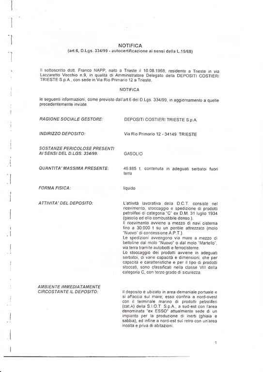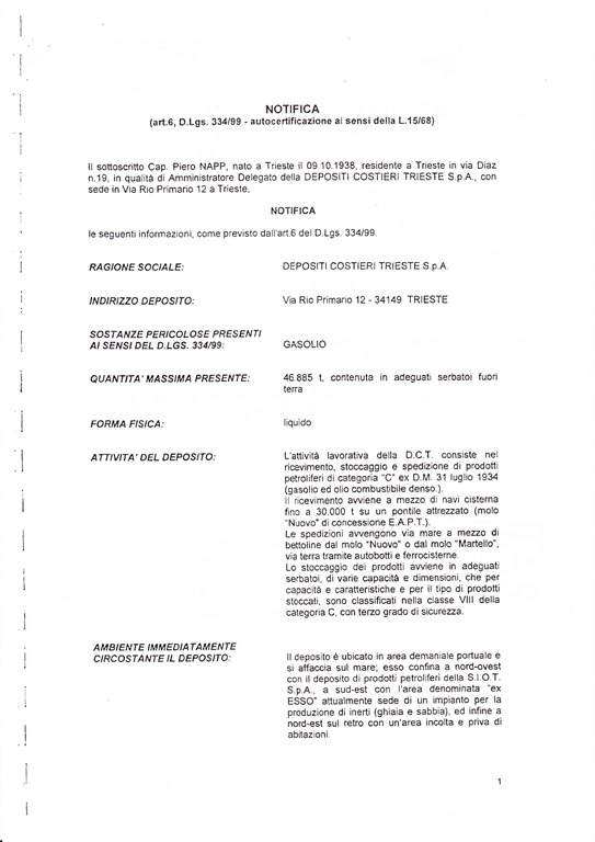 DOC 1 – Originalna izjava o tveganju je leta 2000 predvidevala kot največjo možno nesrečo vžig rezervoarjev nafte z eksplozijami, požari in nevarnostjo za ljudi do območja stadiona in športne dvorane. Kot manjše nesreče je predvidevala izlitje nafte v morje pri pretakanju iz ladij.