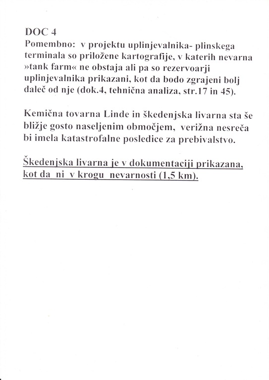 DOC 4 – Pomembno: v projektu uplinjevalnika – plinskega terminala so priložene kartografije, v katerih nevarna “tank farm” ne obstaja ali pa so rezervoarji uplinjevalnika prikazani, kot da bodo zgrajeni bolj daleč od nje (doc4, tehnična analiza, str17 in 45).