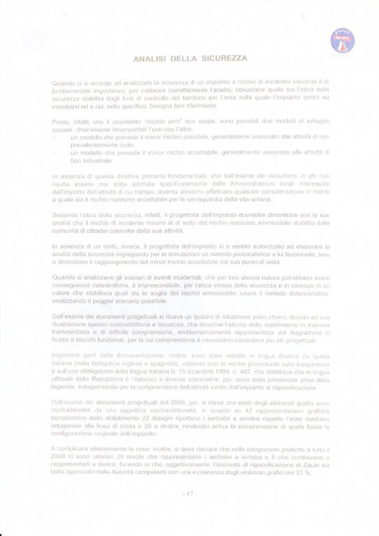 Kršitve zakona Seveso in v Italiji prenesena zakonsko uredba št 21 septembra 2005 – 238, pri načrtovani izgradnji plinskega terminala v Žavljah, ob slovensko – italijanski meji, potrjuje popolno odsotnost kateregakoli načina preprečevanja nevarnosti, ki bi se lahko pripetile v industrijskih obratih. To je naša organizacija že večkrat opozarjala tudi EU institucije.