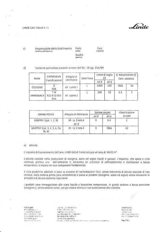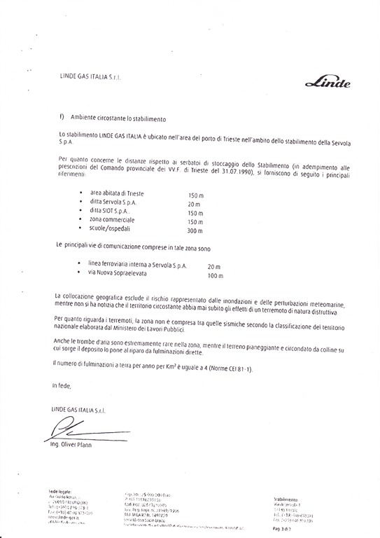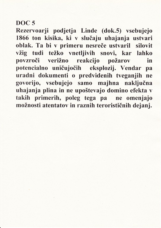 DOC 5 – Rezervoarji podjetja Linde vsebujejo 1866 ton kisika, ki v slučaju uhajanja ustvari oblak. Ta bi v primeru nesreče ustvaril silovit vžig tudi težko vnetljivih snovi, kar lahko povzroči verižno reakcijo požarov in potencialno uničujočih eksplozij. Vendar pa uradni dokumenti o predvidenih tveganjih ne govorijo, vsebujejo samo majhna naključna uhajanja plina in ne upoštevajo dimino efekta v takih primerih.