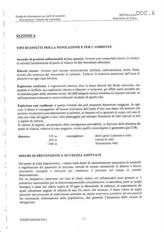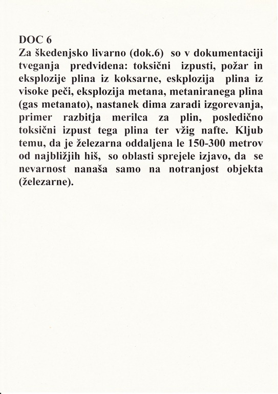 DOC 6 – Za Škedenjsko livarno so v dokumentaciji tveganja predvidena: toksični izpusti, požar in eksplozije plina iz koksarne, eksplozija plina (gas metanato), nastanek strupenega dima zaradi izgorevanja. V primeru, da pride do razbitja merilca za plin, pride do izpusta rakotvornih plinov v okolico, zaradi že tako rakotvornega plina in samovžiga nafte. Kljub temu, da je železarna oddaljena le 150-300 metrov od najbližjih hiš, so oblasti sprejele izjavo, da se nevarnost nanasa samo na notranjost objekta ( železarne)