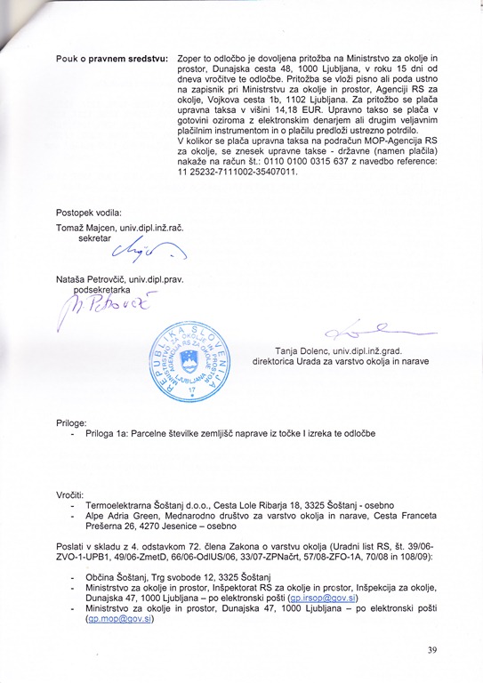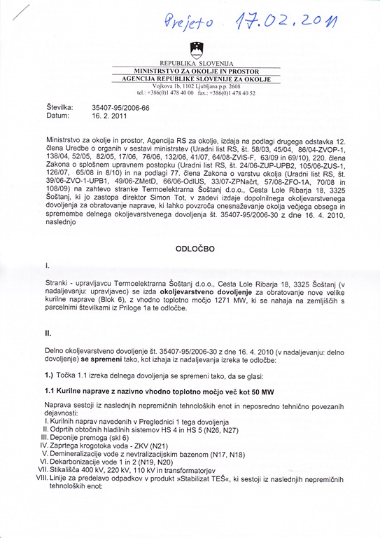 PRVA IN ZADNJA STRAN ODLOČBE ARSO ZA TEŠ 6