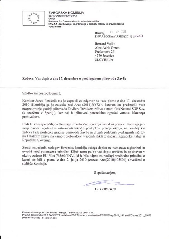 il commissario Janez Potočnik mi ha pregato di rispondere alla Vostra lettera del giorno 17.12.2010 (la commissione l’ha catalogato sotto Ares (2011)55672, nella quale avete presentato le vostre contestazioni riguardo alla costruzione del rigassificatore di Žavlje nel porto di Trieste della ditta Gas Natural SGP S.A. (con sede in Spagna), perche’ questo rigassificatore rappresenterebbe un potenziale rischio per gli abitanti locali.