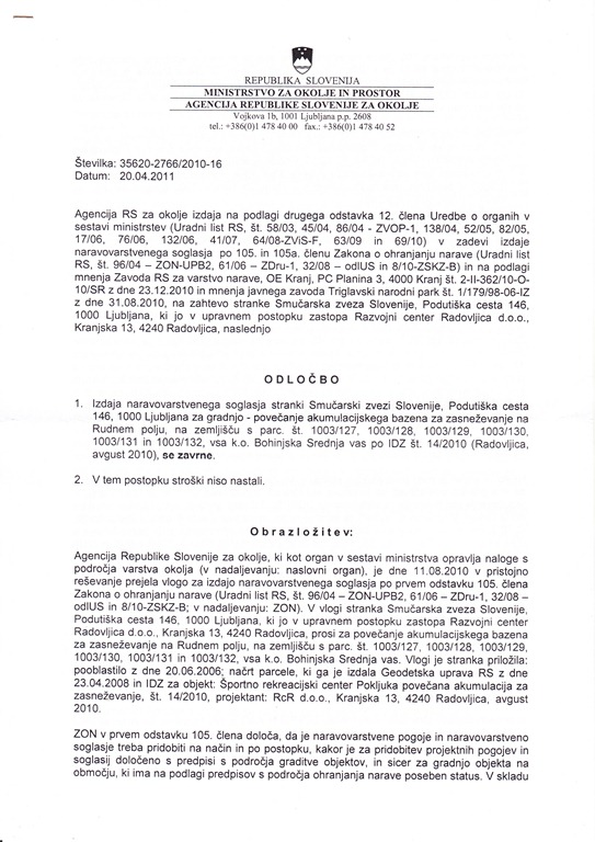 Po enem letu se počasi kaže prava slika tega zakona, saj smo kot stranski udeleženec skupaj z DOPPS-om na Agenciji Republike Slovenije dokazali, da ima izgradnja akumulacijskega jezu za zasneževanje tekaških prog velik vpliv na okolje in naravo ( v prilogi).