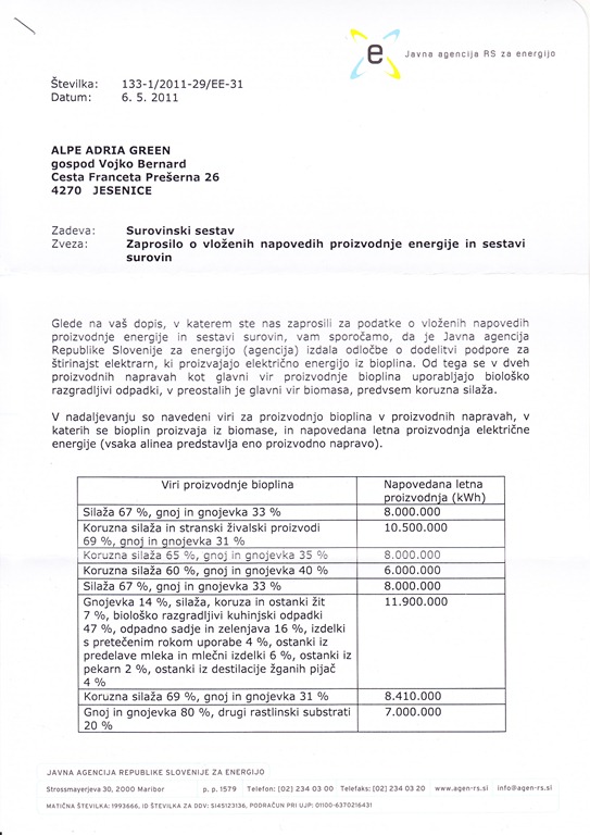 ODGOVOR NA VPRAŠANJE AAG, O SESTAVI SUROVINJ, KI SE KURIJO V BIOPLINARNAH