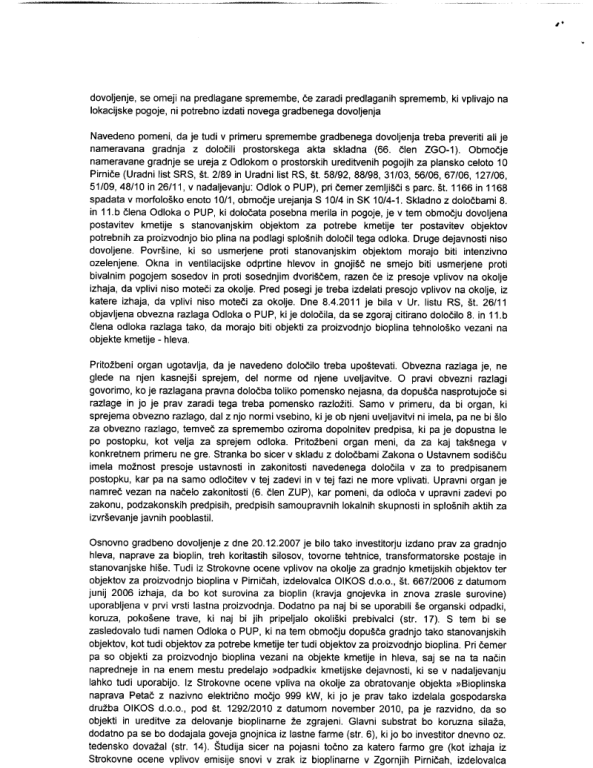 "V konkretnem primeru je investitor bioplinarno že zgradil, z objekti, ki jih prvotno gradbeno dovoljenje sploh ni vsebovalo, in z objekti v drugačni velikosti in na drugi lokaciji, kot je bilo to dovoljeno z gradbenim dovoljenjem. Zgrajena pa ni nista niti stanovanjski objekt niti hlev, na katerega naj bi bil objekt bioplinarne tehnološko vezan. Vsakršno drugačno postopanje bi tako predstavljalo sprenevedanje, obid določb predpisov in bi bilo ne nazadnje v nasprotju z načelom ekonomičnosti postopka," je v svoji odločbi med drugim zapisalo ministrstvo za okolje in prostor. Bioštrom oziroma Miha Petač ima zdaj možnost sprožiti upravni spor zoper omenjeno odločbo UE Ljubljana Šiška, ali je to storil, pa nismo uspeli izvedeti, saj se na telefonske klice ni oglašal.