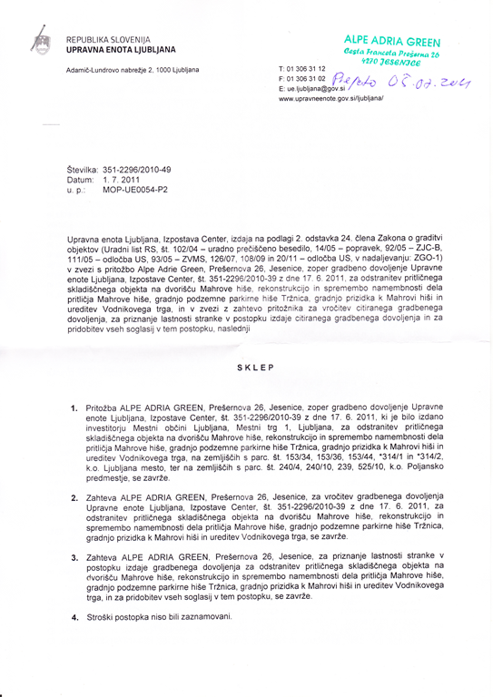 na SKLEP št. 351-2296/2010-49 z dne 1.7.2011, Upravna enota LJUBLJANA,