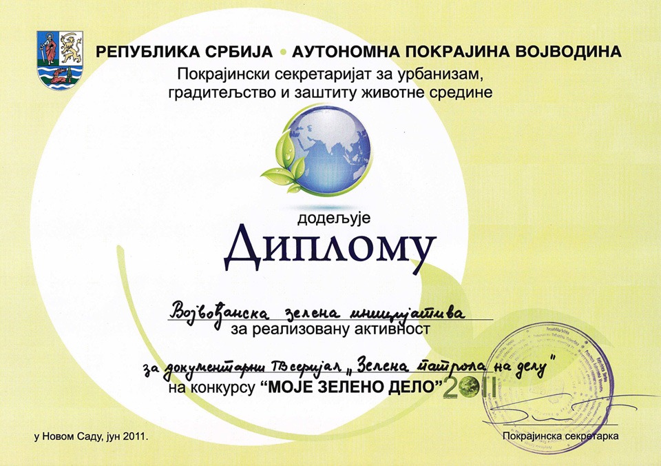 Pokrajinski sekretarijat za urbanizam, graditeljstvo i zaštitu životne sredine svečano je uručio nagrade i priznanja za konkurs "Moje zeleno delo" koje je raspisao povodom obeležavanja Dana planete Zemlje, za najbolje akcije ili dela koja doprinose zaštiti, unapređenju stanja životne sredine i održivom razvoju AP Vojvodine, u petak, 03.06.2011. godine, Nagrade je uručila pokrajinska sekretarka za urbanizam, graditeljstvo i zaštitu životne sredine Dušanka Sremački.