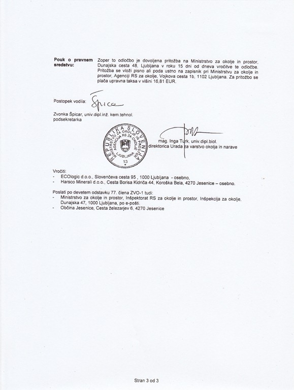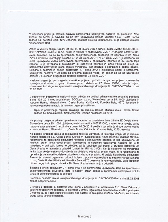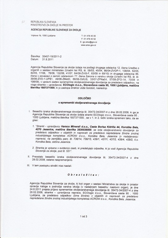 Na zgornji naslov se obračamo z prošnjo, da nam pošlje kopijo odločbe o spremembi upravljavca za predelavo črne žlindre na področju ACRONI- ja, ki ste ga izdali podjetju Harsco Minerali d.o.o., ki je informacija javnega značaja.
