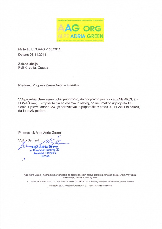 HE Ombla - projekt koji ne drži vodu! PRIOPĆENJE Organizacije za zaštitu okoliša pozivaju Europsku banku za obnovu i razvoj (EBRD) da se povuče iz projekta HE Ombla! Danas, 02.11.2011, aktivisti Zelene akcije, točno u podne, izveli su aktivistički performans ispred zgrade Europske banke za obnovu i razvoj, Miramarska 23, u Zagrebu poručivši: HE OMBLA - projekt koji ne drži vodu. Pri tom su aktivisti pozvali Europsku banku za obnovu i razvoj (EBRD) da se povuče iz projekta HE Ombla! Još 26.10.2011. čak 34 hrvatske i međunarodne organizacije za zaštitu okoliša uputile su otvoreno pismo Europskoj banci za obnovu i razvoj da ne odobri kredit u iznosu od 123 milijuna eura za izgradnju HE Ombla kod Dubrovnika, o čemu će se raspravljati na Upravnom odboru direktora EBRD-a 8. studenog 2011. U otvorenom pismu, organizacije su istakle ekološke, ekonomske i preceduralne probleme HE Ombla, koje su prepoznali čak i konzultanti EBRD-a prilikom ocjene projekta koji su proglasili "visokorizičnim". [1]. Planirana HE Ombla bi potopila špiljski sustav Vilina jama - Ombla koji ima vrlo visoku bioraznolikost [2] te je u planu zaštite kao dio europske mreže zaštićenih područja - Natura 2000. Studija utjecaja na okoliš za ovaj projekt je stara više od deset godina, a pri tom je i nepotpuna jer nekoliko važnih studija još uvijek nedostaje. Ovo je očiti primjer žurbe za izgradnju HE, prije ulaska u Europsku uniju, jer projekt očito ne zadovoljava kriterije europskog zakonodavstva. Šokanto je da javna banka kao što je EBRD financira ovako štetne projekte. "Ipak šišmiši i čovječje ribice nisu jedini ugroženi u ovoj priči. Hidroelektrana se planira graditi u području krša, koje je izuzetno porozno. Nitko doista ne zna koliko su podzemni kanali isprepleteni i podzemne vode povezane, te se betoniranjem tih kanala mogu izazvati neželjeni efekti na povezane sustave podzemnih voda." - naveo je ekspert za krš Dr. Ivo Lučić. Osim utjecaja na okoliš HE Ombla, konzultanti EBRD-a Tractabel Engineering i Projektni Biro Split su zaključili da "projekt neće povratiti investicijske troškove, nego će zahtjevati dodatne troškove... izgradnja HE Ombla može se jedino izgraditi uz značajno financiranje Vlade RH.". Izvještaj konzultanata dodaje kako se problem ekonomske neisplativosti može riješiti i povećanjem cijene električne energije za 200% [3], riješenje koje gražani RH neće dočekati s oduševljenjem. Na tiskovnoj konferenciji medijima se je obratio i Zorislav Anton Petrović iz Transparency Internationala Hrvatske, koji je izjavio: "Podržavamo inicijativu udruga i smatramo da HEP kao društveno odgovorna tvrtka treba provesti dobro proceduru utjecaja na okoliš i javnu raspravu.". "Teško je naći ijedan dobar argument za izgradnju HE Ombla", zaključuje Jagoda Munić iz Zelene akcije (Friends of the Earth Croatia). "Uzimajući u obzir veliki utjecaj na okoliš, u području za ekološku mrežu Natura 2000, projekta koji je ekonomski neisplativ smatramo da EBRD treba izaći iz ovog projekta." Kontakti: Dr.sc. Ivo Lučić, stručnjak za krš, +385 (0)98 347 669 Mr.sc. Jagoda Munić, Zelena akcija/Friends of the Earth Croatia: +385 (0)98 1795 690. ------ [1] "Undertaking the project in full, as designed at present, carries a high risk of the project not achieving its objectives". Tractabel Engineering; Projektni Biro Split: Ombla Hydropower Project - European Bank for Reconstruction and Development - Technical Due Diligence - Final Report Rev. C September 2011, p.9-10 [2] Pet zaštićenih vrsta šišmiša i čovječja ribica (Proteus anguinus), (IUCN Red List (VU); FFH Directive: Annex II, IV; Bern Convention: Annex II), špiljska kozica (Troglocaris anophthalmus), (IUCN Red List (VU)) i jedina špiljski slatkovodni školjkaš, jedinstve u Svijetu (Congeria kusceri), (FFH Directive: Annex II, IV). Osim drugih špiljsik vrsta, četri su roda nađena jedino u sustavu Vilina špilja - izvor Omble, i nigdje drugdje na svijetu: Horatia knorri, Lanzaia kusceri, Plagigeria nitida angelovi (slatkovodni špiljski puževi) te Eukonenia pretneri. Dokaz da špilja nije dobro istražena je nalaz iz 2009 kad je pronađen novi rod kopnenog isopoda. [3] Tractabel Engineering; Projektni Biro Split: Ombla Hydropower Project - European Bank for Reconstruction and Development - Technical Due Diligence - Final Report Rev. C September 2011, p.122-123. ----- Udruge potpisnice otvorenog pisma EBRD-u: Zelena akcija/FoE Croatia, Croatia Croatian Biospeleological Society, Croatia Udruga Grad, Dubrovnik, Croatia CEE Bankwatch Network Friends of the Earth Europe WWF MedPO European Environmental Bureau South East Europe Network on Energy and Transport - SEENET Transparency International Hrvatska, Croatia Zelena Istra, Pula, Croatia Srđ je naš, Dubrovnik, Croatia Eko Centar Zeleno Sunce, Dubrovnik, Croatia Speleološka udruga Vjetrenica Popovo polje, Ravno, BiH Biospeleological Society in Bosnia and Herzegovina Center for Environment, BiH Association for Animal Inventarisation and Conservation, Ilijaš, BIH NGO Green Way, BIH Brodsko ekološko društvo-BED, Slavonski Brod, Croatia Eko Zadar, Zadar, Croatia Sunce, Split, Croatia NGO Baobab, Croatia Speleološko društvo "Mijatovi Dvori " -Tomislavgrad, BIH Udruga Naša Baština -Tomislavgrad, BIH Centar za Održivi Razvoj "Una", Martin Brod - Bihać, BIH Prijatelji prirode / Friends of nature EKO ELEMENT Centar za ekologiju i energiju, Tuzla, BIH Association "Ekotim", Sarajevo NGO "Močvara", Čapljina, BIH NGO "Zeleni Neretva" iz Konjica, BIH U.G. "Sadnice Mira - Peace Trees" Zavidovići Naturskyddsföreningen - Swedish Society for Nature Conservation Asociación para la Justicia Ambiental, AJA Spain Instituto Internacional de Derecho y Medio Ambiente(IIDMA), Spain Ecologistas en Accion, Spain