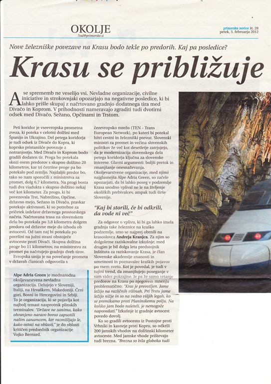 Peti koridor je bil naročen projekt s strani investitorjev, ki je zahteval čim bolj ravno linijo železniške proge prilagojene za velike hitrosti. Za samo traso proge ni bila izdelana študija o vplivih na okolje in bi potekala večinoma po predorih, kar bi nedvomno vplivalo na občutljivo kraško podzemlje, poleg tega pa poteka na območju zaščitenem področju NATURA 2000. V AAG razpolagamo samo z idejnimi načrti te proge, zato ne moremo dati ocene, kako bi umeščanje v prostor te proge vplival na podzemlje, vendar pa je podzemlje krasa, kot drevo, če zadaneš eno vejo ali korenino tega drevesa, bodo posledice vidne na celem drevesu. Poleg tega je kras vodni hram, ki napaja z pitno vodo velik del Slovenije in bi bile posledice pri morebitnem onesnaženju izredno velike, kar se je pokazalo tudi v „Postojnskem“ primeru, čeprav vzrokov ne moremo izenačiti. V AAG smo v tem primeru že poleti opozarjali pristojne službe, da se lahko zaradi malomarnega odnosa do okolja lahko zgodi onesnaženje pitne vode, vendar nas ni nihče jemal resno.