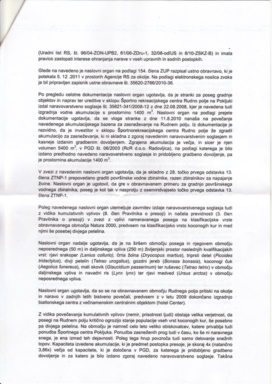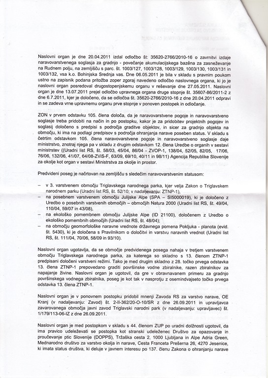 Dodal je, da so jim v Arsu podobno odločbo izdali že pred časom, vendar je drugostopenjski organ (ministrstvo za okolje in prostor) prvostopenjsko odločbo odpravil in Arsu naložil, naj začne nov postopek. Prepričan je, da bodo tudi v tem primeru dokazali, da večji akumulacijski bazen bistveno ne vpliva na naravno okolje, in pri tem izpostavil, da raste populacija divjega petelina na tem območju.