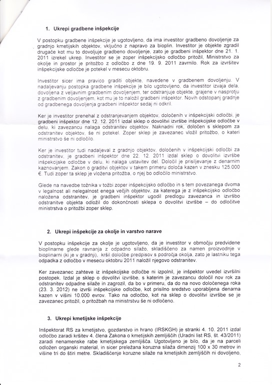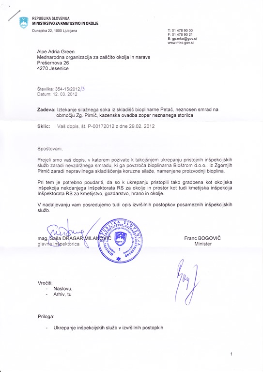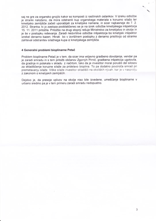 Stanje v bližnji in širši okolici Bioplinarne Petač v Zg. Pirničah je nevzdržno. Na lokaciji bioplinarne, katere lastnik je Petač Miha nekdo, namesto da bi gnilo in razpadajoča biomaso skladno z odločbami pristojnih inšpekcijskih služb odstranil iz lokacije nedovoljene gradnje leto zopet prevaža iz kupa na kup. Posledično se v ozračje širijo plini, ki med drugim povzročajo tudi neznosen smrad ter iz navoženih kupov izteka neznana tekočina. Lokacijsko se to izvaja pri silosu na kmetiji g.Petača. Uredba o mejnih vrednostih vnosa nevarnih snovi in gnojil v tla (Ur.l. RS 84/05) določa, da je gnojenje z gnojevko ali gnojnico prepovedano tudi na zemljiščih na najožjem vodovarstvenem območju in na stavbnih zemljiščih, kar zemljišče na katerem izteka neznana tekočina podobna gnojevki tudi je.