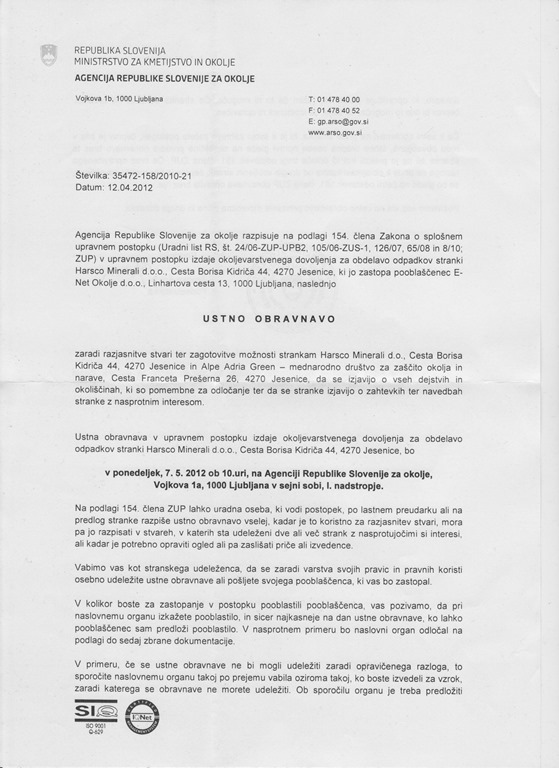 RAZPISANA USTNA OBRAVNAVA ZA PRIDOBITEV OKOLJEVARSTVENEGA DOVOLJENJA–HARSCO MINERALI–PREDELAVA ŽLINDRE ZA ACRONI D.O.O.