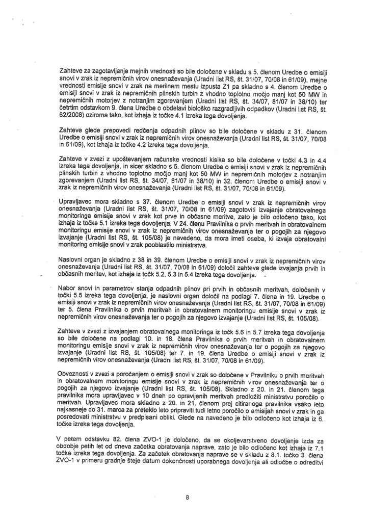 8) Okoljevarstveno dovoljenje je bilo izdano ne glede na to, da upravljalec nima osnovnih pogojev za skladiščenje substrata in drugih goriv, saj le te skladišči na prostoru, ki ni pokrit in iz njega odtekajo izcedne vode, kar ni v skladu z našo zakonodajo ( 19. člen Zakona o varstvu okolja).