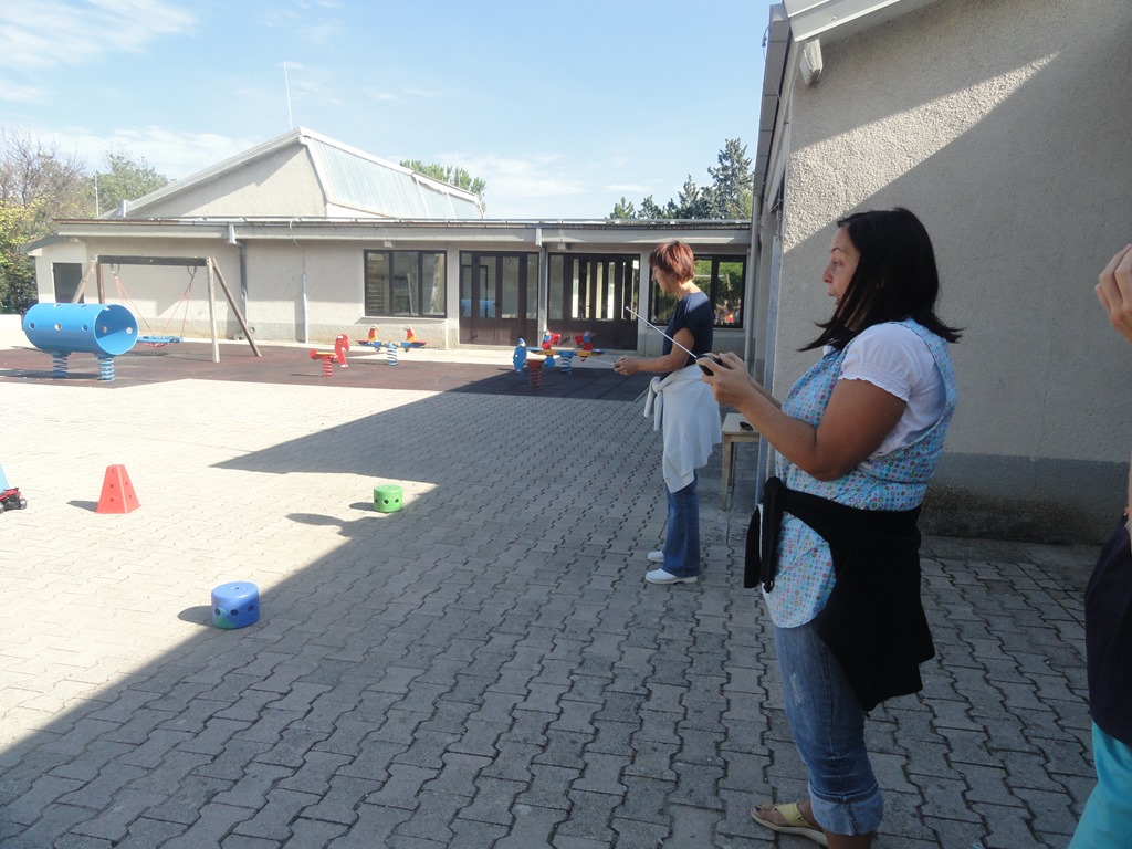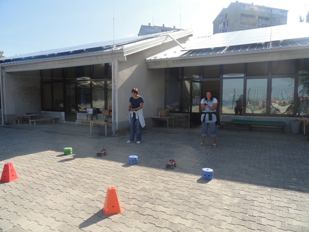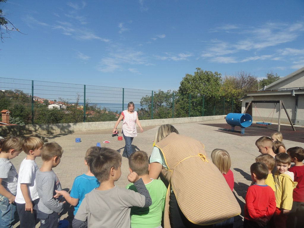 Nato smo otroke povabili na zunanje dvorišče, kjer so se na pripravljenem poligonu lahko preizkusili v upraljnaju električnega avtomobilčka. Vozili so med keglji in se ustavli na STOP znaku. Igra je bila zabavna, otroci in vzgojiteljice pa zelo zadovoljni.