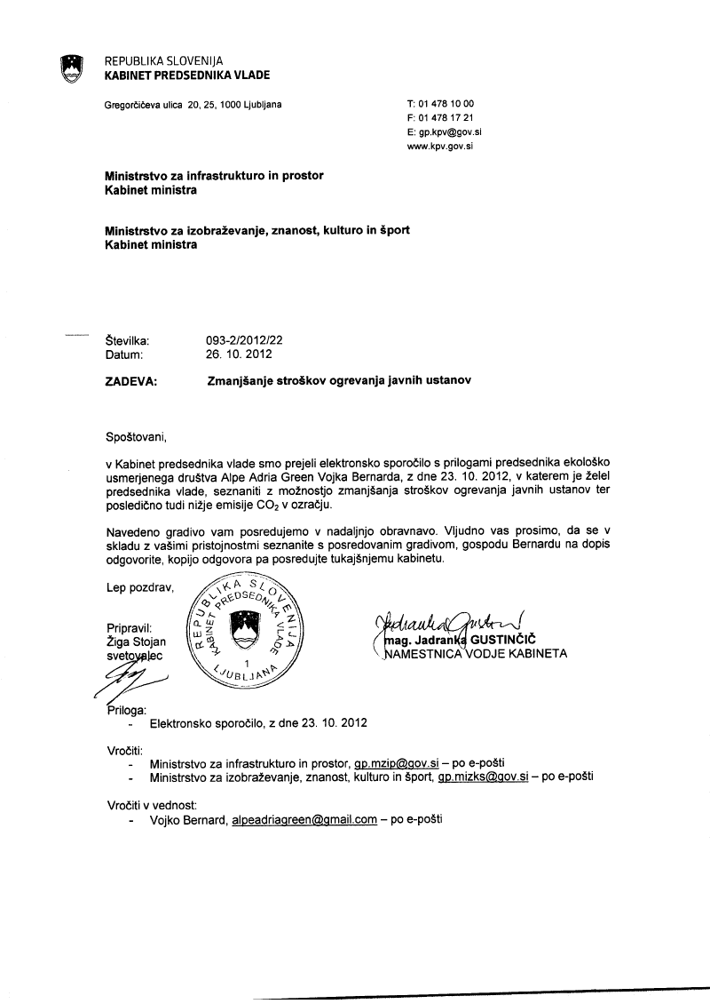Zadeva : Ogrevanje javnih objektov – nezainteresiranost ravnateljev šol in direktorjev javnih ustanov ter zavodov za zmanjšanje letnih obratovalnih stroškov