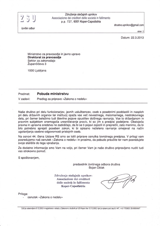 Prilagam zakonsko pobudo Združenja stečajnih upnikov, nastalo na predlog predstavnikov Civilne družbe za demokracijo in pravno državo. Gre za osnutek »zakona o nedelu«, katerega smo v petek posredovali prisojnemu ministrstvu v razmislek. Nestrpno pričakujem njihov zavrnilni odgovor. Le s čim ga bodo tokrat argumentirali in poskusili ohranjati obstoječi sistem nazadovanja in vsesplošnega razsula v Republiki Sloveniji?