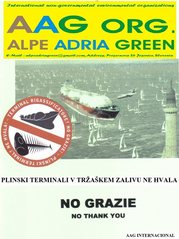V ponedeljek 24.06.2013 smo komisarju za energetiko pri EU komisiji, g. Güntherju Oettingerju, poslali peticijo »PROTI POTRDITVI UMESTITVE PROJEKTA PLINSKI TERMINALI ŽAVLJE NA EVROPSKO LISTO PRIORITET SKUPNEGA POMENA (PCI)«. mednarodne okoljevarstvene organizacije Alpe Adria Green ter neposredno ekološko, varstveno ter ekonomsko ogroženih obalnih slovenskih občin Koper, Piran in Izola ter obmejne Italijanske občine Milje v tržaškem zalivu. Peticija je bila poslana zaradi predvidene izgradnje plinskih terminalov v tem zalivu, ki jih nameravajo potrditi na EU listo prioritet skupnega pomena za energetiko (PCI). Peticijo je podprla tudi luka Koper (Kopersko pristanišče) zaradi ekonomskih ter razvojnih vzrokov, ker bi postavitev teh plinskih terminalov ogrozilo njen obstoj, saj je locirana na isti oddaljenosti od predvidenih plinskih terminalov kot luka Trst, zaradi katere so tudi začasno zamrznili okoljevarstveno dovoljenje. S postavitvijo plinskih terminalov bi, ravno tako kot luko Trst, ekonomsko uničili luko Koper, ki je edina slovenska luka in država Slovenija tega preprosto ne more dovoliti, saj ne bi bila več pomorska država. Peticijo je podprlo tudi več kot 350 članov AAG in podpornikov AAG iz obeh strani meje Slovenija – Italija.