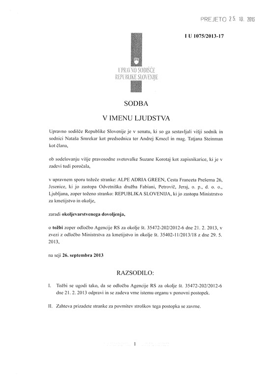 Upravno sodišče, je v celoti sledilo naši argumentaciji in razveljavilo okoljevarstveno dovoljenje. Sodišče se je v veliki meri oprlo na evropsko zakonodajo in na konkretne primere, na katere stalno opozarjamo tako na naših spletnih straneh kot v dopisih in pritožbah na državne institucije. S tem sklepom Upravnega sodišča smo v največji meri uspeli nadomestiti zamujeno, saj smo se v postopek vključili šele v fazi tožbe.
