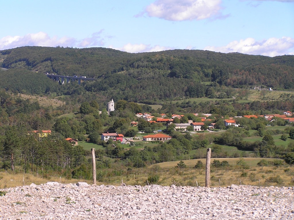Bližnje hiše v Dolenji vasi v razdalji okrog 900 m od vetrnice, v ozadju avtocesta Razdrto – Koper in Senožeška brda.