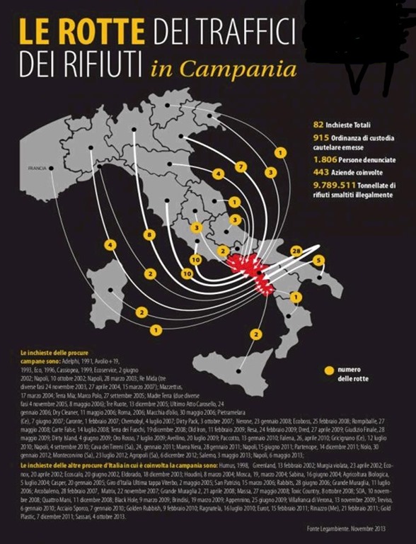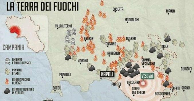 Leta 1996, to je skoraj pred 20 leti, je neki mafiozo pred sodiščem v podrobnosti razložil kako in kje je mafija zakopavala vsemogoče odpadke, tudi zelo zelo strupene. Razne industrije iz cele Italije in tudi iz inozemstva so vozile svoje tovornjake polne nevarnih odpadkov proti jugu Italije, kjer so jih prevzela mafijska podjetja. Namesto da bi te odpadke uničili tako kot je treba, so jih enostavno zakopali! Izbrali so najrodovitnejše področje v okolici Neaplja, ki slovi po najboljši zelenjavi, paradižnikih, sadju, mozzareli itd. Področje, kjer vidiš obsežna polja velikih pridelovalcev in tudi na stotine malih kmetov, poljedelcev, ki tam živijo od prodaje svojih poljedelskih proizvodov.