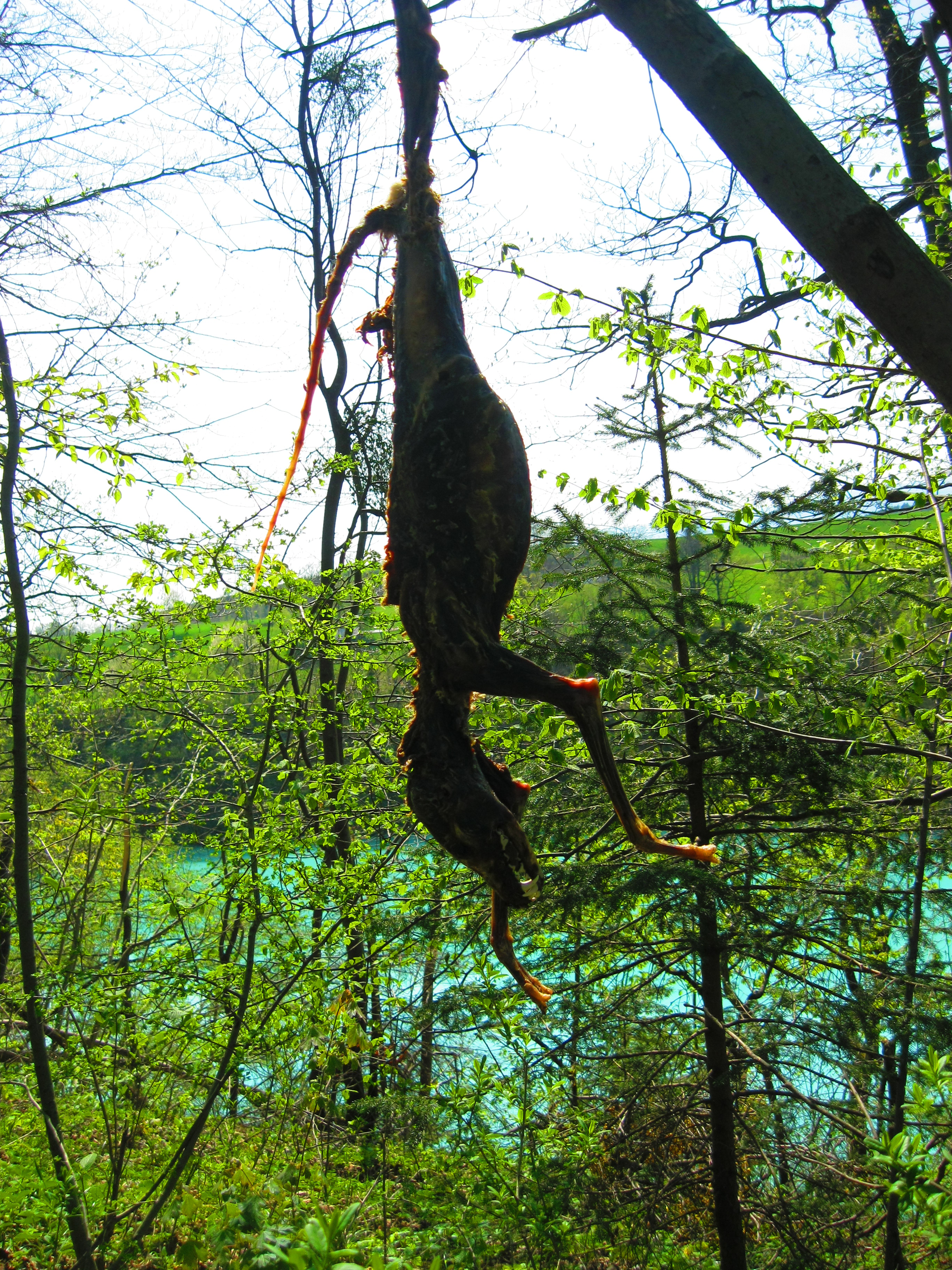 Predstavniki organizacije Alpe Adria Green so na Gorenjskem našli živalsko truplo, ki je viselo z drevesa. Inšpektor na kraju ni mogel z gotovostjo potrditi vrste živali, prav tako ni našel mikročipa. Pozor, fotografija trupla je nazorna!