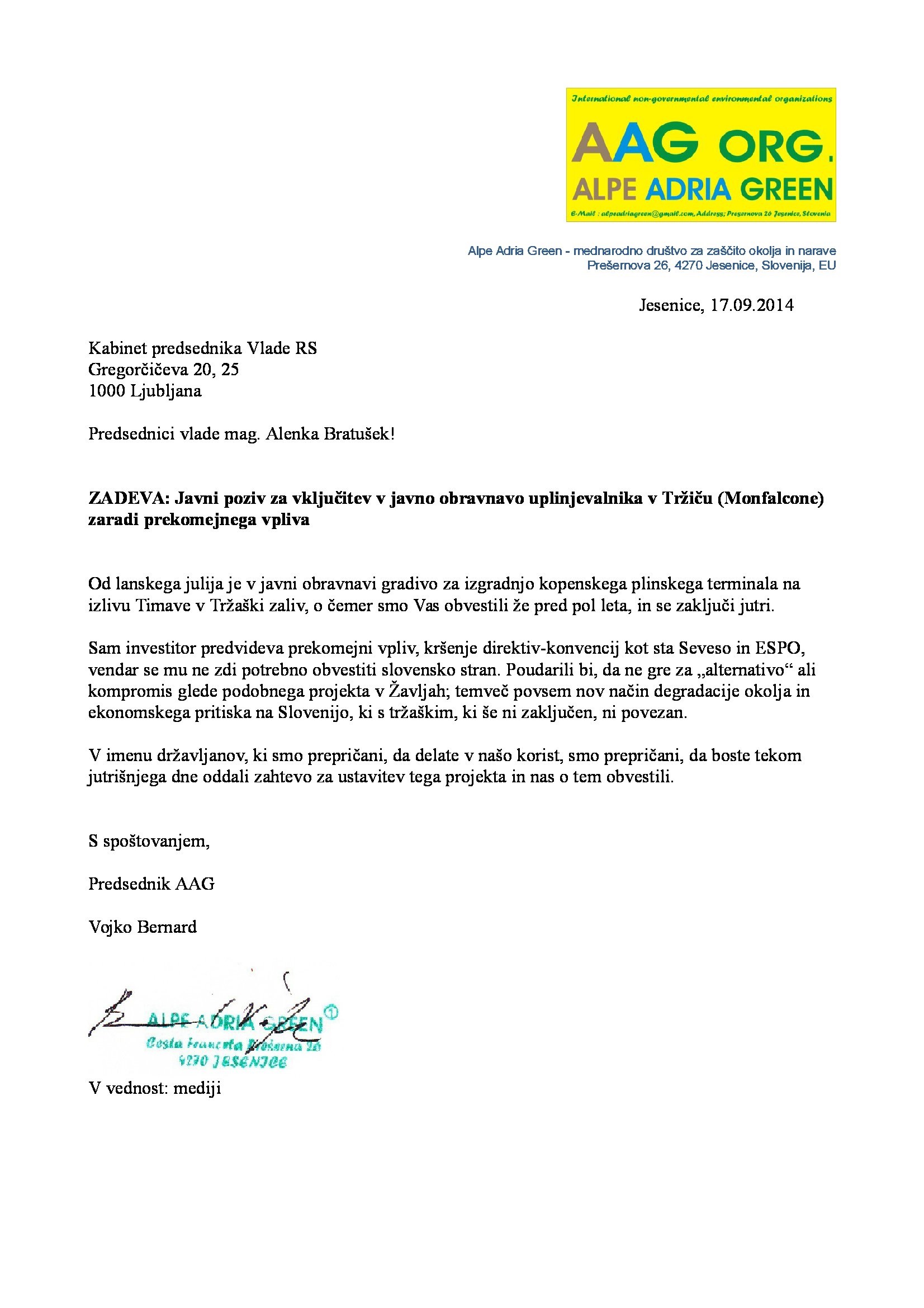 »V Sloveniji smo že večkrat nasprotovali netransparentnemu umeščanju plinskih terminalov v Tržaškem zalivu, v neposredni meji med Slovenijo in Hrvaško. To je območje, kjer prebiva okoli sto tisoč ljudi, to je območje, kjer sta dve pomembni pristanišči – Koper in Trst, območje, ki je zaznamovano s turizmom.