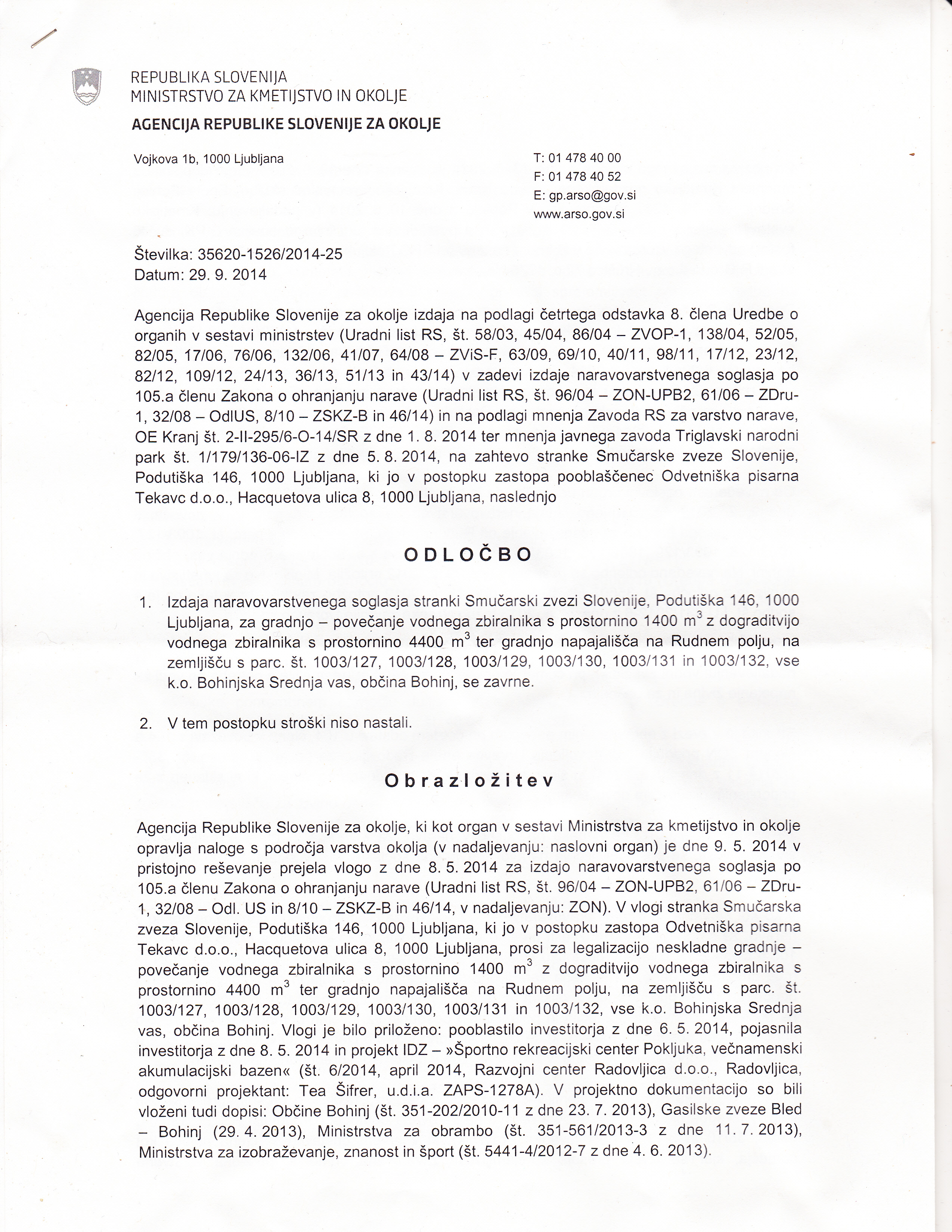 K vlogi za izdajo naravovarstvenega soglasja posredovani na ARSO z dne 8.5.2014, za »legalizacija neskladne gradnje – povečanje vodnega zbiralnika s prostornino 1400 m3 z dograditvijo vodnega zbiralnika s prostornino 4400 m3 ter gradnjo napajališča na Rudnem polju v k.o. Bohinjska Srednja vas, občina Bohinj« so priloge in dopise posredovali: