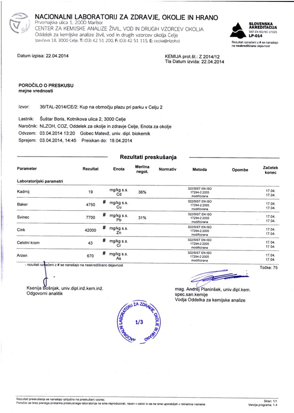 Pošiljam Vam 22.4.2014 prejete analize treh uradno odvzetih vzorcev zemljine v celjskem parku, neposredno zraven sprehajalnih poti in blizu vodnjaka Meškov studenec, kjer vsa leta. prebivalci Celja točijo domnevno »neoporečno« vodo za pitje.