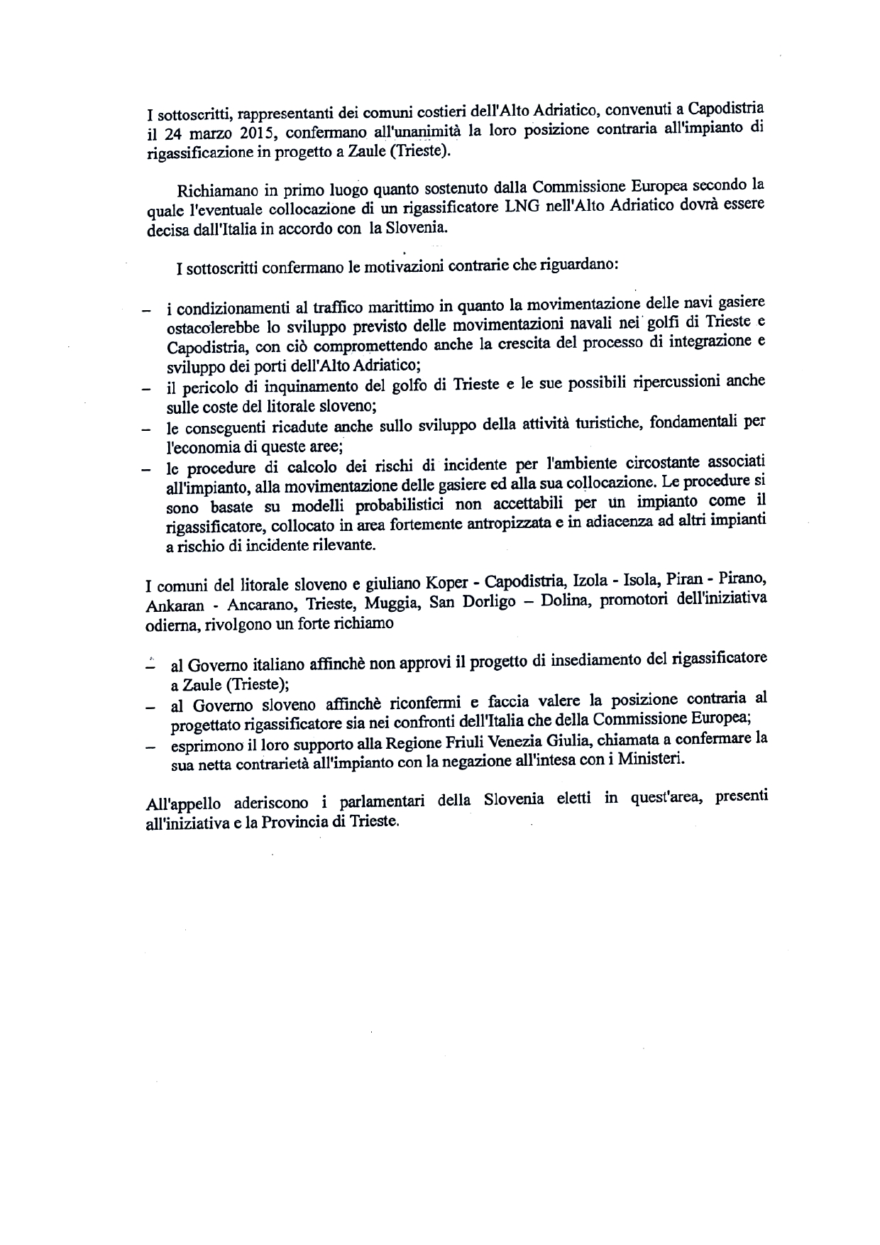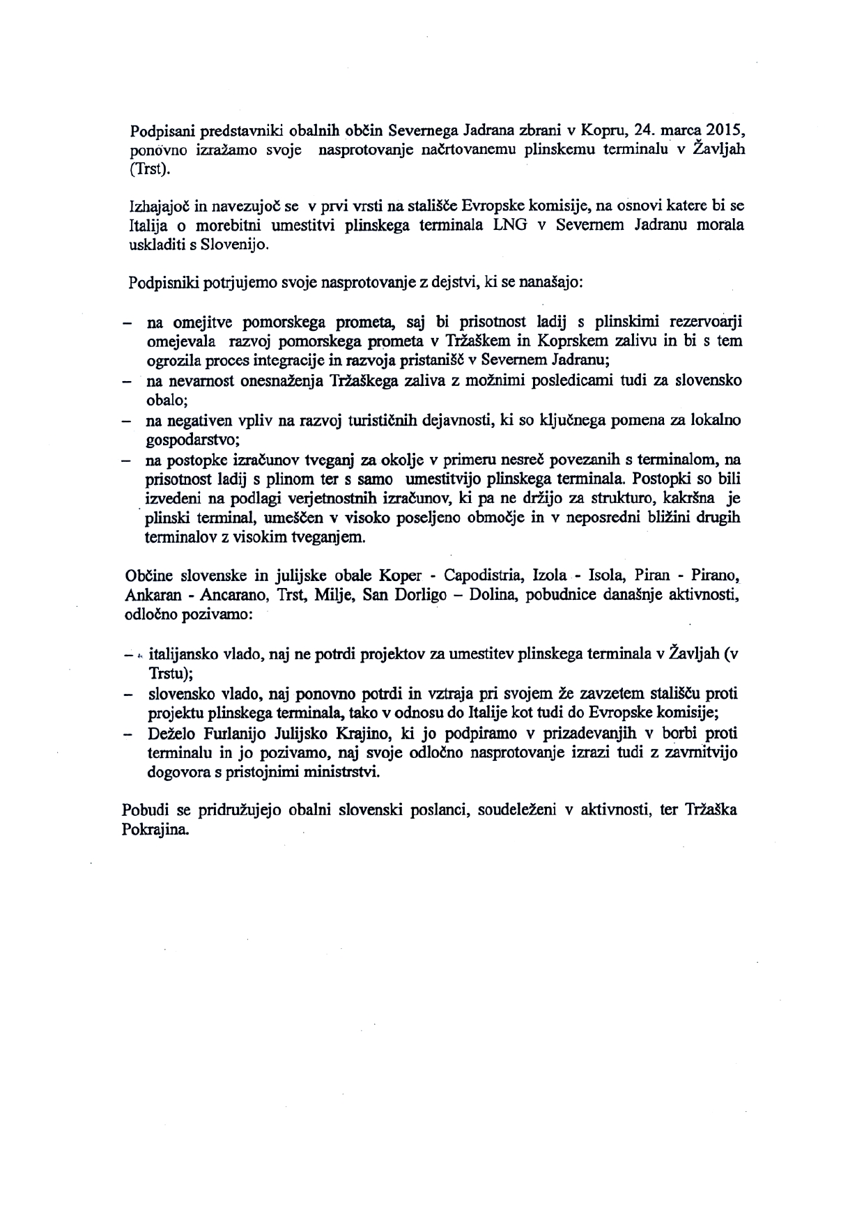 Predstavniki Mednarodne organizacije Alpe Adria Green, v katero so včlanjene civilne iniciative od Italije do Makedonije, smo se 24.03.2015 v Kopru udeležili udeležili javne tribune na temo ponovne aktualizacije izgradnje plinskega terminala v Žavljah. Na tej tribuni je podpisan s strani udeležencev tudi poziv, ki je bil s strani MOK poslan 26.03.2015: