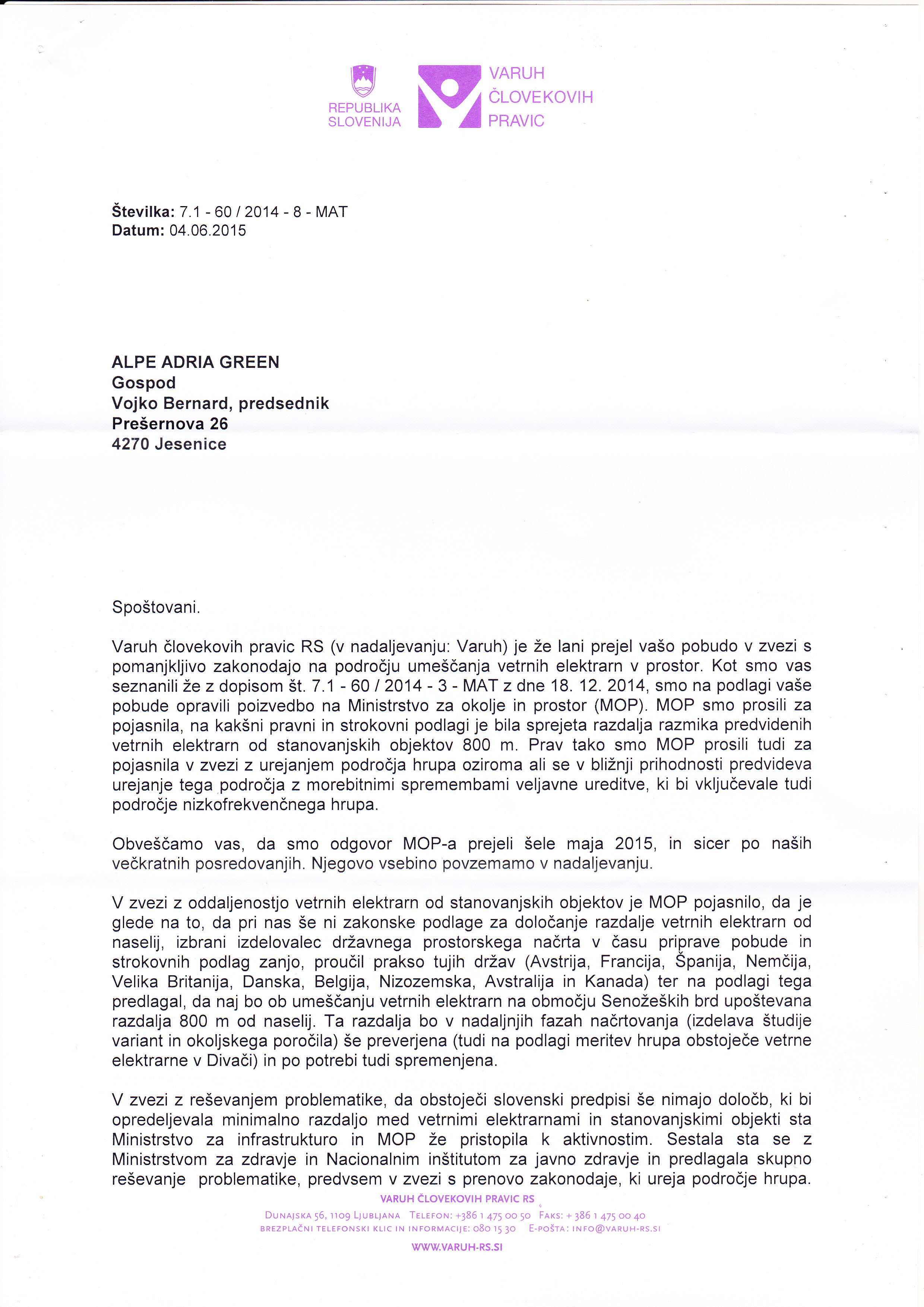 Zaradi polovičnega odgovora, ki smo ga iz MOP prejeli 07.01.2015 v zvezi s pomanjkljivo zakonodaja na področju umeščanja vetrnih elektrarn v prostor, smo se obrnili na varuhinjo človekovih pravic in jo prosili za posredovanje.