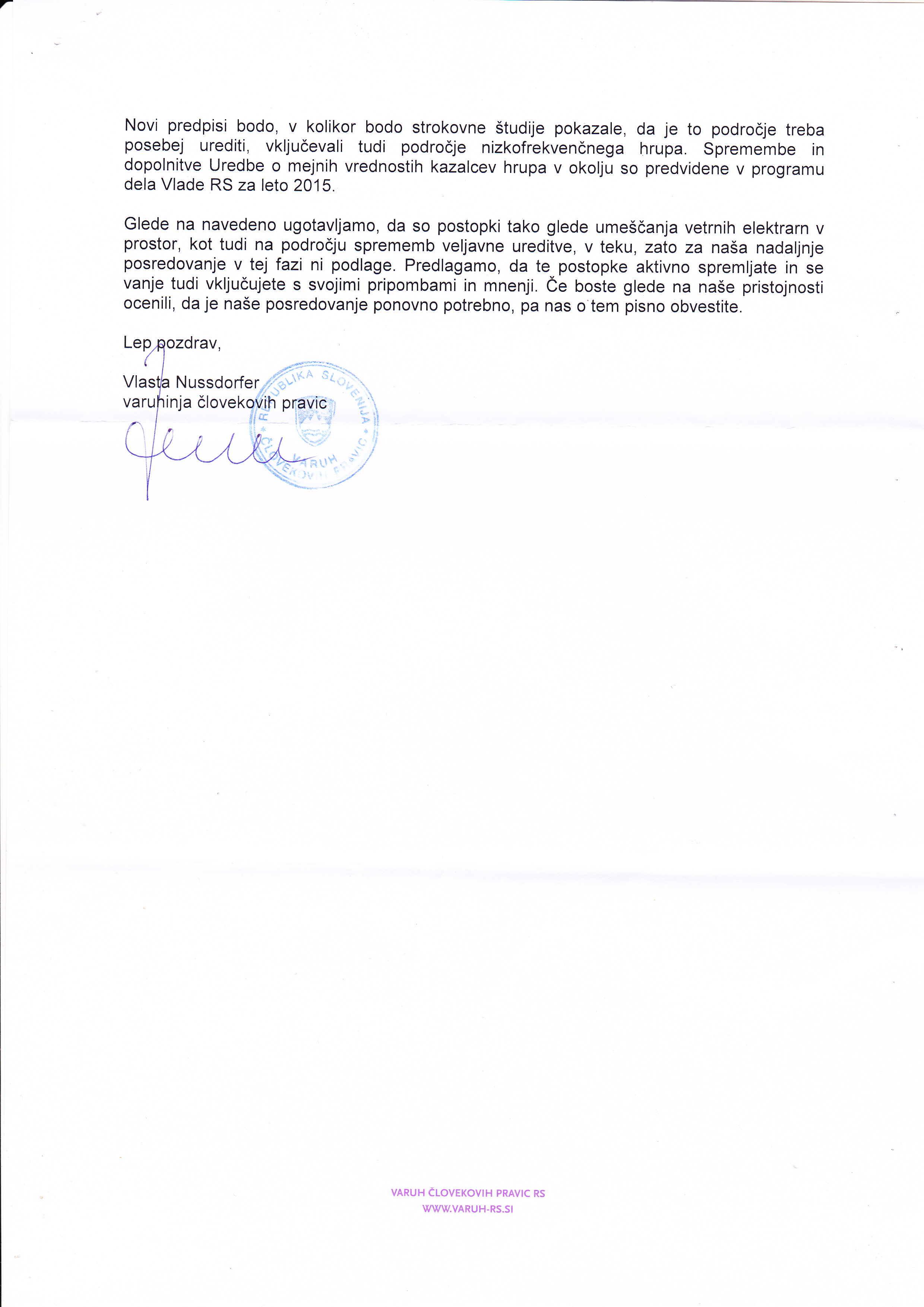 Za posredovanje se Varuhinji najlepše zahvaljujemo. Še naprej bo AAG delal na tem področju, vse do ureditve vse zakonodaje na področju vetrnih elektrarn.