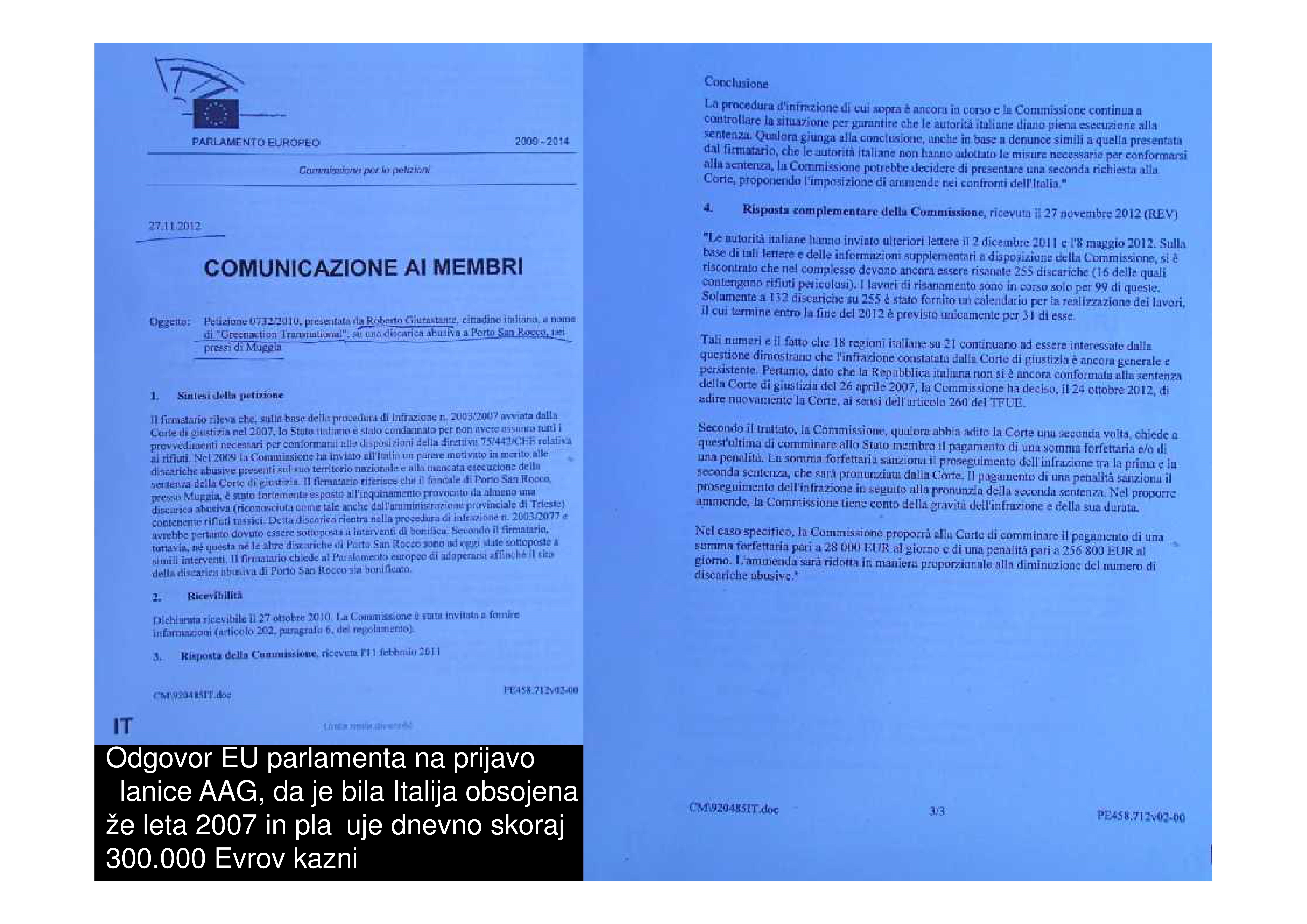 Odgovor EU parlamenta na prijavo članice AAG, da je bila Italija obsojena že leta 2007 in plačuje dnevno skoraj 300.000 Evrov kazni Foto: AAG