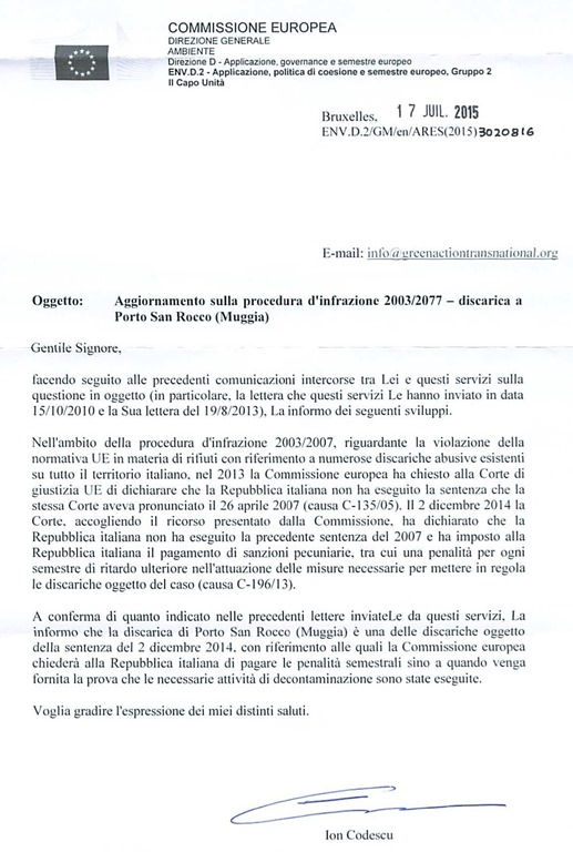 Kljub zidu iz gum, ki so ga postavili italijanski organi, se je situacija odprla, ko sem predstavil pritožbo na Evropsko unijo. Evropska komisija je obravnavala pritožbo za nezakonito smetišče Porto San Rocco v postopku za ugotavljanje kršitev 2003/2007 proti Italiji.