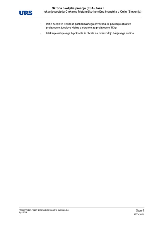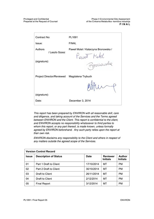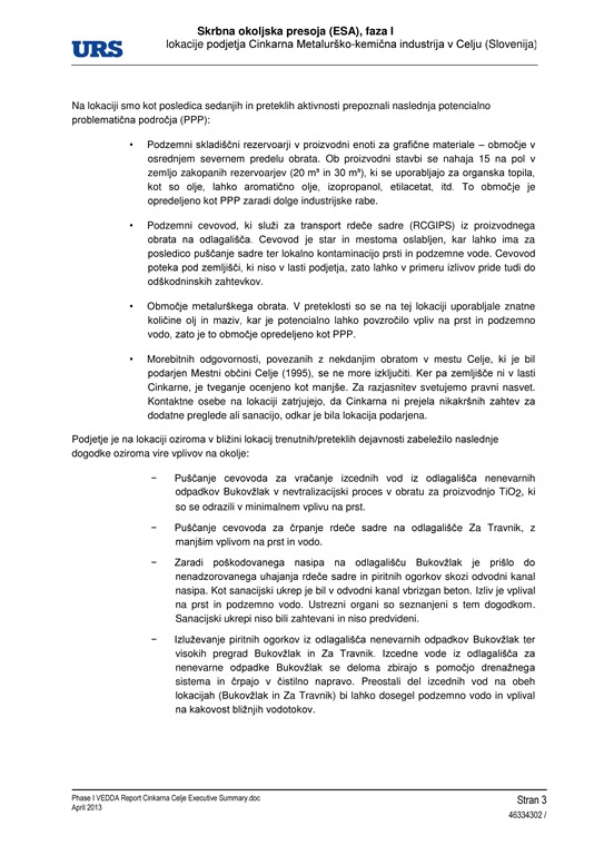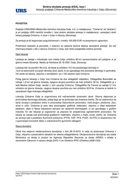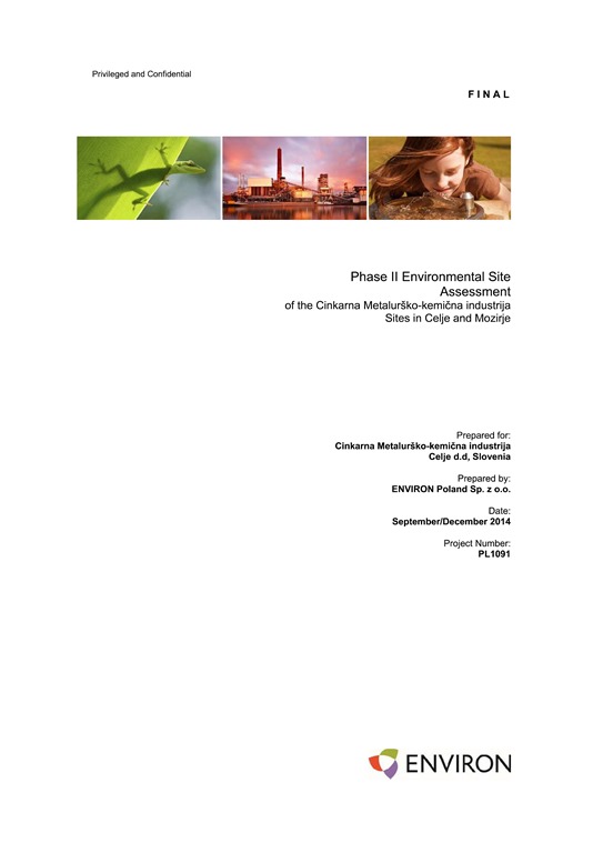 Avgusta 2014 je Cinkarna Metalurško- kemična industrija Celje, d. d. (družba) naročila izvedbo skrbnega okoljskega pregleda lokacije (Faza II) in pripravo poročila o okoljskih vplivih (Faza II), da preveri stanje onesnaženosti tal in podtalnice na zemljišču, s katerim upravlja. Skrbni okoljski pregled (Faza II) je opravila družba ENVIRON Poland Sp., z. o. o. Ta povzetek vsebuje bistvene ugotovitve in priporočila, ki izvirajo iz opravljenega pregleda. Za več informacij se povežite z upravo družbe.