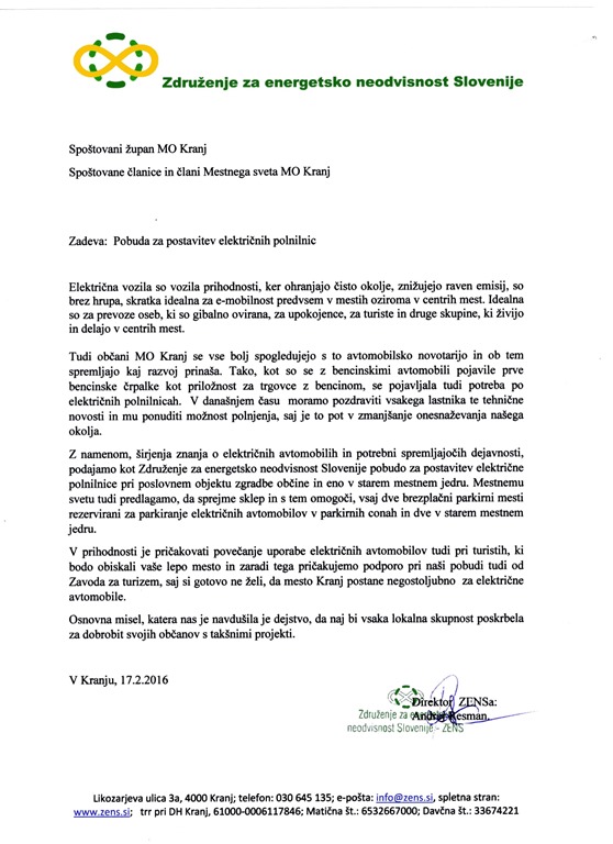 V sredo 17.2.2016 je Združenje za energetsko neodvisnost Slovenije ( www.zens.si ) predala nepoklicnemu podžupanu MOK Borisu Vehovcu pisno pobudo za postavitev nekaj električnih polnilnic za potrebe oskrbe z energijo za električne avtomobile, kakor tudi omogočitev brezplačnega parkiranja na mestnih parkiriščih.