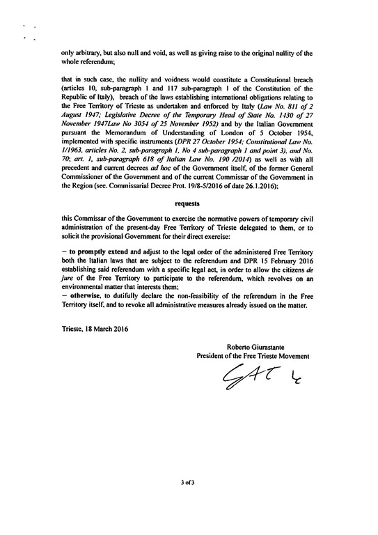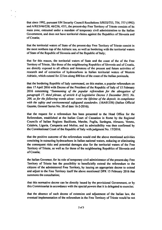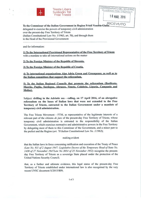 Dne 18. marca, je komisar italijanske vlade formalno potrdil, da se v Tržaški pokrajini izvede referendum, ki bo potekal 17. aprila o raziskavah in pridobivanju ogljikovodikov v Jadranskem morju (glej prilogo, v angleškem jeziku).