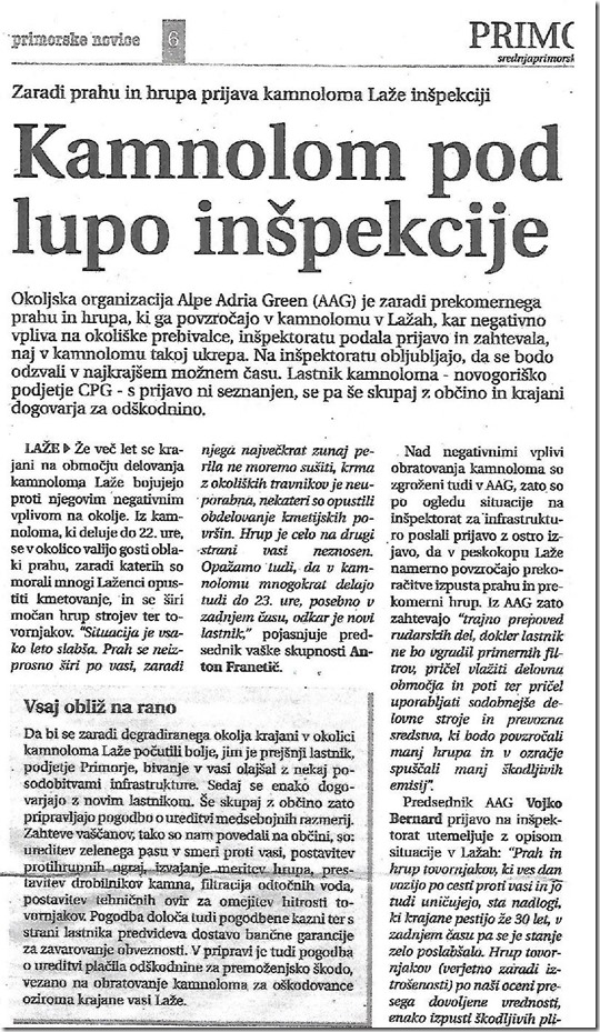 AAG je 06.09.2016 podal prijavo na inšpekcijske službe ter na posamezna ministrstva zaradi onesnaženja in prevelikega hrupa, ki ga povzroča Kamnolom Laže. Za to prijavo smo se odločili po opravljeni EKO – PATRULJI 30.08.2016.