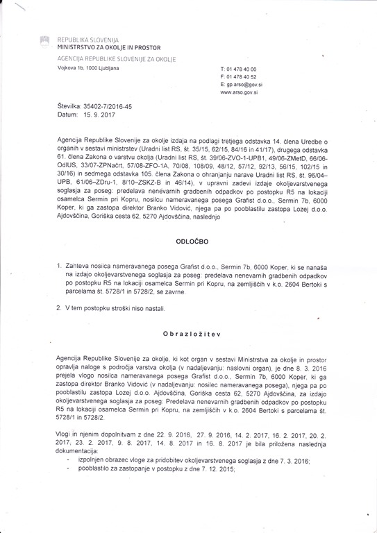V Alpe Adria Green (AAG) smo 28.november 2016 zahtevali na ARSO vstop v postopek izdaje okoljevarstvenega soglasja, ki ga je vložil Grafist d.o.o.,za poseg ureditve sortirnice nenevarnih odpadkov na lokaciji na lokaciji osamelca Sermin pri Kopru.