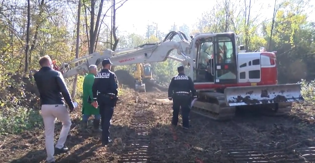 V torek je podizvajalec MOL skušal na silo nadaljevati svoja dela, a ga je spet ustavila policija. Njihovo akcijo je posnela ekipa Drugorazredni. (Foto: Eko-patrulja AAG)