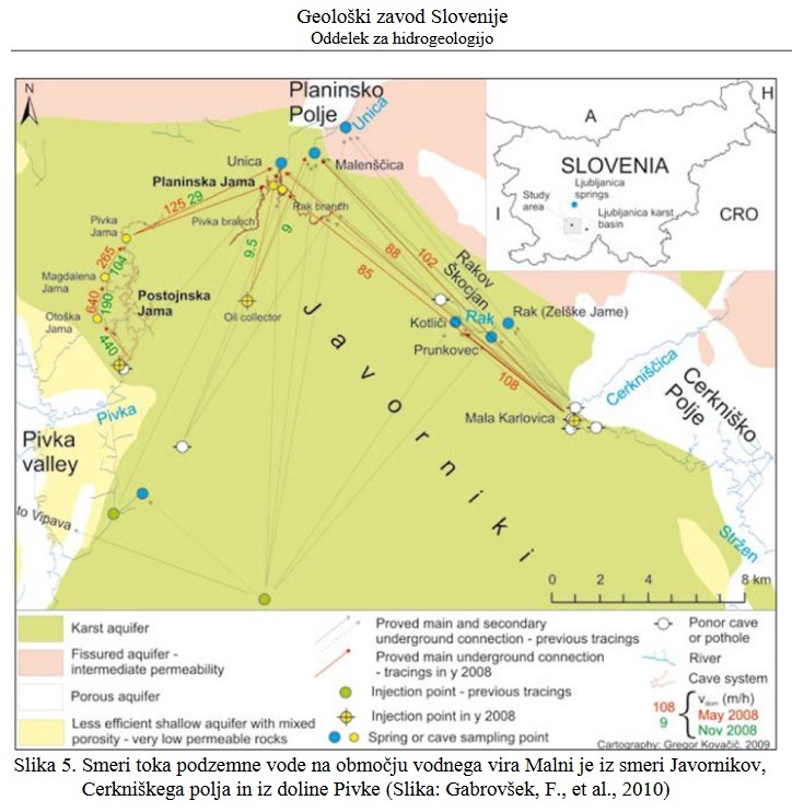 Kogovšek J. (1999) ugotavlja, da »rezultati sledilnega poskusa, tako hitrosti pretakanja, kot deleži sledila, ki so se pojavili v Malenščici in Vipavi, narekujejo veliko previdnost pri načrtovanju aktivnosti na območju Počka.